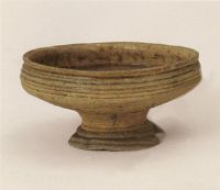 上為直口微斂,壁略鼓、圜底、淺盤,下為喇叭形座。通體飾并列弦紋,器表施青綠色釉。胎質(zhì)堅硬,釉面晶亮。