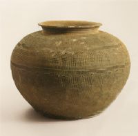小口外侈,低領,圓肩。深腹圓鼓、平底。頸部飾弦紋,肩與腹拍印密集的小方格紋。呈灰色。造型莊重深厚,裝飾華麗。系實用的印紋硬陶甕。