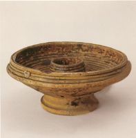 大口,沿內(nèi)折、淺盤,壁斜直、圜底,喇叭形座。別致的是在盤內(nèi)底部中間帶粘結(jié)有一個(gè)直口、直壁杯形器。盤內(nèi)周壁、杯外壁、外沿面上均飾密集而排列有序有弦紋。器表施青色薄釉。造型奇特,裝飾精美,是一件罕見(jiàn)的原始瓷器珍品。