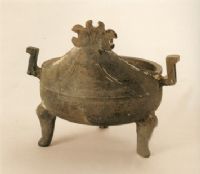 敞口微斂,口沿前邊塑造一獸頭,口沿兩邊有兩個(gè)對(duì)稱的折頂方形耳,淺腹、圜底、三個(gè)蹄形足。造型別致,形象生動(dòng),系春秋戰(zhàn)國時(shí)期盛行的獸頭鼎形式。