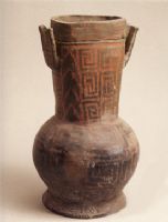 長方形直口,長頸微向內(nèi)收,腹圓鼓,圈足形平底。頸部兩側(cè)有兩個對稱的豎方形耳?诓扛采w有頂部內(nèi)凹的長方形蓋。通體塗黑地,并用紅色繪出不甚規(guī)整的大小相連接的云雷紋圖案。