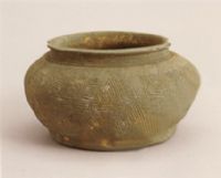 陶瓿,平沿短直口,溜肩,扁圓腹,平底微內(nèi)凹,頸部飾五道弦紋,周身用套菱形田字紋和弦紋組成幾何圖案,整體紋樣拍打印跡較深,且剛勁有力。器體陶色灰黑,火候高,應(yīng)為較上乘的印紋硬陶。瓿是一種盛貯器,西周至漢代較為流行。除印紋陶瓿外,還有原始青瓷和青、黑釉瓷瓿等。