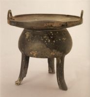 砂質(zhì)灰陶。盤形敞口、折沿、沿上有對稱雙耳,頸內(nèi)收,扁圓腹、圜底,三個下部外撇的圓柱體足,器表素面,磨制光滑。是具有江南地方特征的陶炊器。