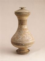細(xì)泥彩陶。敞口,細(xì)長(zhǎng)頸內(nèi)收,扁圓腹,圈足?谏仙w有帶握手的器蓋。通體用紅、白彩繪制出弦紋與渦紋等彩色紋飾。