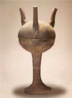 泥質(zhì)灰陶。由兩個(gè)半球形器組合。上部為蓋,蓋作倒鼎形,三足朝上,足間以弦紋相隔。下部為淺盤,高柄,凹底,足沿成喇叭形。器柄至足部有三組共計(jì)十四道弦紋,器身飾有朱繪。其造型具有戰(zhàn)國(guó)時(shí)期的典型特征。