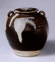 罐口外撇,短頸,圓腹,平底,肩部兩面各有一系,器里外施黑褐色釉,外部施釉不到底,罐口和腹身各有三塊及四塊灰藍色斑紋