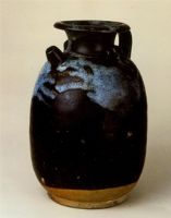壺口外卷,短頸,豐腹,平底,肩上一面凸起一短流,另一米有執(zhí)柄,柄連于頸肩之間,另兩面各有一圓系,釉呈黑褐色,肩部有大塊藍(lán)斑三組,柄,口,頸,系均微帶藍(lán)斑,壺身施釉不到底。壺造型秀雅而富于變化,是唐代執(zhí)壺的典型之作。黑褐色釉面上,星星點(diǎn)點(diǎn)自然流溢的藍(lán)色斑紋,頗增添其藝術(shù)魅力。