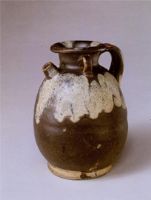 壺撇口,短頸,長腹,腹部上部小,下部豐滿,平底。壺身部一面有短流,流口削平,一面有雙帶形曲柄,柄連于口肩之間,另兩面各有一系。壺施黑褐色釉,里滿釉,外部施釉不到底,口部有斑紋三塊,腹部兩面有不規(guī)則斑點,均為灰藍(lán)色。這件花釉壺的產(chǎn)地,應(yīng)為唐代河南郟縣黃道窯或內(nèi)鄉(xiāng)窯的產(chǎn)品,因為相同類型的瓷器殘片標(biāo)本在上述兩窯中均有發(fā)現(xiàn)。
