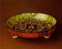 盤撇口,豐底,下承以三環(huán)形足。盤心刻花,中心刻一花蕊,外環(huán)一周蓮瓣紋,紋內(nèi)刻花,盤里施黃,藍,白,綠等色釉,盤外為黃釉,底無釉。這件唐代三彩刻花三足盤,器形完整,圖案大方,蓮瓣紋鮮明突出,是唐代佛教盛行在陶瓷藝術(shù)中的反映。