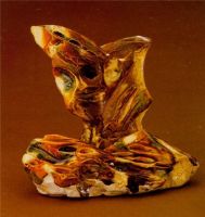 唐代風(fēng)行厚葬,并明文規(guī)定了不同等級(jí)的官員死后使用明器的數(shù)量和內(nèi)容。唐三彩中的雕塑作品全部用于陪葬,這件三彩山子,以自然界中的太湖石為雕塑原形,通過鏤孔,透雕等手法將洞石的透,漏,瘦,皺等特點(diǎn)表現(xiàn)得惟妙惟肖。通體施黃,綠,白三色彩釉,班駁艷麗的色彩,更襯托出洞石的玲瓏剔透。