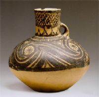 直口、長頸、鼓腹,壺頸與壺身連接處有一單柄,表面磨光,以黑色和紫紅色彩繪出網(wǎng)格紋、旋渦紋等紋飾。出土于甘肅省碾伯省。