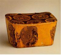 此枕形制小巧,呈長方形,胎質(zhì)堅(jiān)硬,枕邊壁有一小孔,通體施黃褐色透明釉,釉下裝飾有黑褐色胎泥絞成的五瓣團(tuán)花,花紋優(yōu)美,自然天成,為絞胎器中的上品。