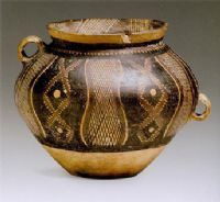敞口、短頸、鼓腹,有不對稱的兩系,通體磨光,以黑色和紫紅色彩繪出葫蘆紋、網格紋、菱形紋等紋飾。