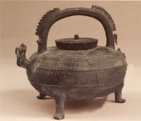 小口低領(lǐng),口上蓋有平頂直壁帶鈕蓋。廣肩,扁圓腹,圜底,三獸蹄形足。肩的前部有龍首流。相應(yīng)肩的后部有小尾,流與尾間有一象征龍?bào)w的拱形提樑。樑脊上又飾有四段脊棱。器表滿塗青綠色釉。系江浙地區(qū)東周時(shí)期盛行的提樑壺形器。