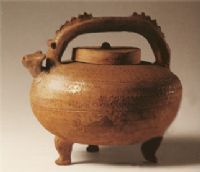 小領(lǐng)口,口上蓋有平頂直壁帶鈕蓋,圓肩、扁圓腹、圜底,三個蹄形足。肩部前有龍首形流,前后肩間有拱形龍體提樑,提樑上部有兩段鋸齒紋脊棱。腹部飾數(shù)行錐刺紋,通體塗有一層豆褐色薄釉。形似青銅提樑壺。