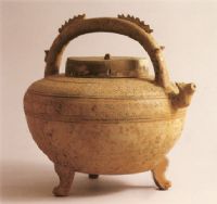 小口、低領,口上蓋有平頂直壁帶鈕蓋。圓肩、圜底,三個獸蹄形足。肩部前有龍首形折角管狀流,前后肩間有拱形龍體提樑。提樑上部有兩段鋸齒紋脊棱扉牙,肩部與腹上部由S形紋與弦紋組成兩周寬帶條裝飾。通體塗有一層青褐色薄釉,也是具有江南地方特征的提樑壺。