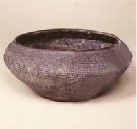 灰褐印紋硬陶。斂口、低領(lǐng)、寬肩、扁圓腹、平底。器表滿飾蔴布紋,肩部加飾S形附加堆紋。形制規(guī)整,工藝精湛,火候頗高,胎質(zhì)堅(jiān)硬。