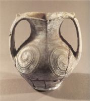 泥質(zhì)灰陶。方口折沿,方頸內(nèi)收,腹圓鼓,平底?谂c腹間有對稱雙耳。腹部刻四個對稱的云雷紋。造型奇特,裝飾美觀。