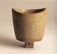 印紋硬陶。橢圓形凹口,扁圓體,凸圓頂、圓柱形柄。鉦的中部拍印由密集云雷紋組成的帶條。因系硬陶,擊之可發(fā)出青脆的金石聲。應(yīng)是仿制青銅鉦的明器,制作精巧玲瓏。