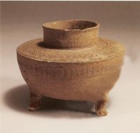 原始青瓷。小口、直領(lǐng)、折肩、淺腹略鼓、圜底、三個(gè)獸蹄形足,肩部飾有三周弦紋與斜線紋帶條,上腹部飾波浪紋帶條。通體施青綠色薄釉。造型別致,器表裝飾華麗,釉面晶亮,是一件具有很高工藝價(jià)值的原始瓷器。