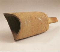 原始青瓷。仿青銅編鐘形制,頂上有長方體鈕,扁圓體鐘身,凹弧形口,鐘體上部拍印有連續(xù)三角紋裝飾。通體施青黃色薄釉。制作精巧而逼真。