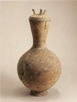 泥質(zhì)灰陶。口微外侈,細長頸內(nèi)收,深腹圓鼓,圈足,口上覆蓋有三個獸頭形鈕器蓋。在頸部與腹部又用紅、白彩繪出各種花紋,并在腹部繪出兩個對稱的鋪首銜環(huán)與羽毛狀裝飾。