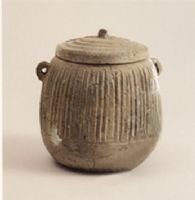 細(xì)泥質(zhì)灰陶。斂口、低領(lǐng)、圓筒形腹略鼓,平底。近口部有兩個(gè)對(duì)稱雙系耳,口部覆蓋有直沿圓鼓頂帶握手器蓋。蓋面飾數(shù)周凸棱形旋紋、腹部飾同豎線組成的瓦楞紋寬帶條。制作精巧,裝飾美觀。