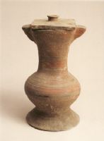 方口外侈,雙耳與器口平,耳面剔刻勾連云雷紋。方形蓋,蓋上有圓鈕,鈕面內(nèi)凹。粗長頸,圓腹,喇叭狀高圈足。從壺頸至足有弦紋數(shù)道。周身彩繪,飾勾連云雷紋,彩繪脫落,不甚清晰。此壺造型古拙、制作規(guī)整,具有鮮明的時(shí)代、地方特色.