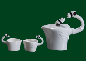 據(jù)德化陶瓷工藝師介紹,“團團圓圓”瓷壺為心形造型,高15厘米、寬18厘米;瓷壺蓋上雕有一頭黑白相間的熊貓,壺的把手為竹節(jié)形狀,頂端雕有一頭黑白相間的熊貓與壺蓋熊貓相對應,象征“團團圓圓、長相廝守”。壺外配上兩只心形小茶杯,把手上也各雕有一頭憨態(tài)可掬的熊貓,與茶壺相呼應,表達了兩岸人民共盼闔家團圓的美好愿望。