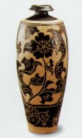 小口,口外有較寬的邊唇,似蘑菇狀,束頸,斜肩,深腹,平底。胎為淺棕黃色,施褐釉,以剔地刻花技法進行花紋裝飾。腹部為兩個對稱的花形開光,內飾花紋主題為折枝牡丹花,以零亂的牡丹葉子填空。下腹部刻畫一鹿紋。近底處及底部均未施釉。