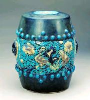 繡墩呈鼓式,中空,面微鼓。墩面中心鏤刻牡丹紋。腹上下各飾凸起鼓釘紋,腹中部鏤雕有鳳來(lái)儀圖,朵朵牡丹競(jìng)相怒放,枝葉縱橫交錯(cuò),洞石交疊,山影重重,祥鳳翩翩起舞。腹兩側(cè)各貼塑一獸面耳。通體所施釉色為白、藍(lán)、紫及孔雀藍(lán)四種。