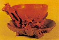 此杯系明末清初宜興著名陶工項圣思的傳世作品。胎質(zhì)細(xì)膩,色紅潤,為宜興窯燒造。杯形似半剖的桃子,又以枝葉作杯把,三小桃為足。造型自然,甚有意趣。
