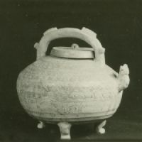 仿青銅香,形制逼真.小園口,鼓腹,三獸足.背腹上有夔紋提梁,腹一側(cè)飾龍首形流,另一側(cè)飾龍尾,肩腹部刻劃五組重線水波紋.有蓋,中有小園幾紐,面刻S形紋,施青綠色薄釉.