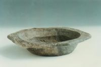 夾炭黑陶,敝口,沿為不規(guī)則六角形,上面刻劃有花草紋。淺腹,平底。