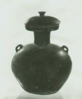 盤(pán)口,有蓋,細(xì)直頸,斜肩,鼓腹,平底,肩部置二系,通體施黑褐色釉,器身素面無(wú)紋,蓋面三道弦紋,平面圓鈕。