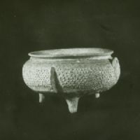 口沿外撇,短頸、鼓腹、三實足。腹部有兩條鋸齒狀凸棱,肩腹部貼繩紋雙系,外腹部飾變形云紋。釉層剝落。