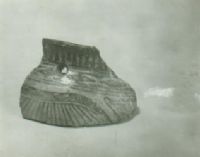 為近口沿部分的殘片,上部分繪有粗豎條的黑色彩繪,下部分為細(xì)豎條的紅色彩繪,底為白色陶衣光亮細(xì)潔,胎色灰黑,胎質(zhì)較一般陶器堅(jiān)硬.