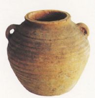 泥質(zhì)紅陶。直口,平沿內(nèi)凹,短頸,溜肩,鼓腹,平底。肩部飾對(duì)稱(chēng)半環(huán)狀繫,在胎體上從肩部至下腹作出數(shù)道瓦溝狀弦紋。