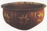 泥質(zhì)紅陶。侈口,寬沿,鼓腹,平底。器身凃紅白陶衣及紅、白、黑彩?谘厣舷嚅g繪相對的褐彩三角紋和紅黑豎條紋。腹部橫向繪七個白色八角星,外以黑變勾勒。中間開紅色方形空地。八角星之間以白色雙豎條紋相隔。