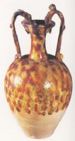 盤口,細頸,豐肩,鼓腹,下腹斜收,平底。兩側(cè)各置一螭形耳,兩螭首伸向瓶口;野滋ァ1P口內(nèi)外及器壁施黃、褐、綠三彩釉,呈斑點狀。釉不到底。