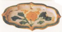 八曲海棠式,折沿,淺腹,平底。內(nèi)底印一枝凸起的牡丹和兩只對飛的蝴蝶,邊飾卷草紋一周,黃花綠葉輿白地相映成趣,具有淺浮雕裝飾藝術效果。內(nèi)外口沿沿施黃釉,中間的卷草紋帶施綠釉,胎質(zhì)堅硬,胎色土黃,上敷白色化妝土。