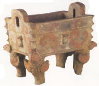 泥質(zhì)灰陶。長方口,平唇,直耳,方穿,直腹,平底,鳥形柱足。器身四個面的中部和四角均飾一條突出的出戟紋。鼎身朱繪卷雲(yún)紋,鳥形足的鳥首及雙翅也施有朱繪。