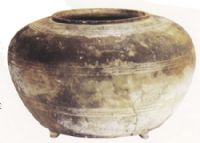 泥質(zhì)黑陶。敞口,短頸,廣肩,扁鼓腹,平底,底置三足且外撇。肩、腹等距離雕飾凸弦紋。黑皮磨光陶是東周時期流行的製陶風尚,可作斷代標準器。