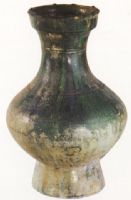 泥質(zhì)紅陶?谖⒊蓿L(zhǎng)頸,溜肩,圓腹略扁,高圈足。頸、肩、腹部飾弦紋。器表施綠釉。