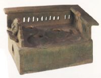 泥質(zhì)紅陶,通體施綠釉。竈呈長方形,竈頭有三角形小火門,上有擋火壁。竈面上有三個(gè)火眼,各置一釜。竈的後端應(yīng)有煙道,竈左側(cè)和後端設(shè)有高約九厘米的圉屏式隔煙槽,隔煙牆上排列著稠密的長條形散煙孔。後側(cè)隔煙牆的正中有象徵煙道的立柱痕跡,現(xiàn)已缺失。
