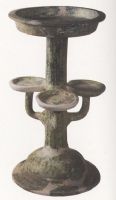 泥質(zhì)灰陶,通體施淺綠色釉。燈呈多枝形。喇叭形燈座,圓形燈柱,中空。燈柱中部裝有水平的三個(gè)小燈盤,頂端為主燈,燈盤較大,盤徑二十點(diǎn)五厘米。