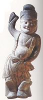 泥質(zhì)灰陶。男俑作舞蹈狀,頭戴襆頭,寬額大臉,面帶微笑,袒胸露腹,身穿窄袖長袍,足穿長筒靴,右手上陽舞袖,左手持腰扭動身軀。
