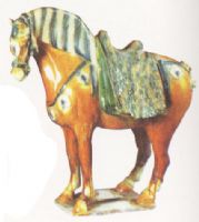 黃褐色馬,馬頭低垂,披鬃縛尾,前腿直立,後腿微曲,立於長方形踏板上。馬具齊全,鞍上搭藍白色障泥。馬鬃赫藍白相間,胸前及股後的革帶上掛杏葉狀飾物,上繪白色雙體寶相花紋。