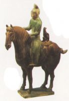 俑頭戴褸殞,面容清秀,身穿綠色圓領(lǐng)長衫,雙手持韁,騎於馬上。馬背上立一獵犬,頭部昂起,神胎機警,其下墊有一塊圓形花墊子。馬頭昂起,雙耳直立,披鬃束尾,膘肥體壯。施紅釉。