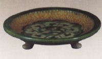 敞口,寬平沿,圓唇,淺腹,平底,下設(shè)三個(gè)馬蹄足。盤內(nèi)底中心以綠色釉為地,上繪彩色飛雁及彩雲(yún),外壁施黃釉。